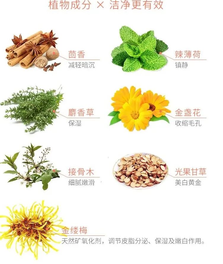 添加茴香果、光果甘草植物成分,清洁肌肤的同时使皮肤柔软细嫩,白皙透净,深层洁净等功效。